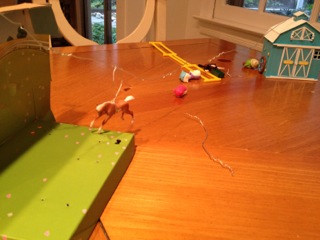 Yesterday, I arrived at Annika’s house and she had just gotten home from a visit to the toy store with Grandma. Annika loves horses and Grandma had bought a little barn set with 2 play horses. Removing the packaging requires some ingenuity as each piece is wired so securely into place. Once I got all the pieces free, Annika started to play with the horses but that wasn’t enough. She suggested we make a zip line from the barn to the cardboard box that had housed her toy! We wove together the wire and made an attachment for the horses and the fun began. I could have used this play scenario for a language lesson but we were working on /r/ so sliding a “horse” from the “barn” for “more” “rides” fit right into my plans to work on /or/ and /ar/ words!