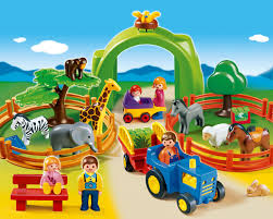 Look for toys that have a few related props for open-ended play that your child can direct. Playmobil’s 1.2.3 sets are geared for toddlers, providing simpler chunky figures that only take a twist to sit them down, or ride on an animal. The Playmobil 1.2.3. Large Zoo comes with fence sections to enclose the animals, a tractor and detachable trailer to deliver the food, and plenty of people, including mom and baby to chat on a park bench.