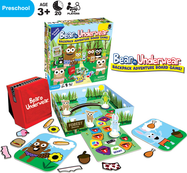 Kids reached for “Bear In Underwear” when I said the name–what fun playing with bears in their underwear! Players travel around the 3-D game board, through the forest and over the bridge, landing on colored spaces directing them to collect their animal’s favorite food, forest item and underwear. Land on spaces numbered from 1-3, and reach into the red box backpack to pick out that number of items that might match your animal card. I needed a cookie, flower and pink underwear for my bear, while my little friend chose what he called the monster who needed a hamburger, acorn and blue polka dot underwear. It you don’t get a match you can offer it to another player. Additional stops on the game board, ask kids to get up and act like their favorite animal, or act out eating their favorite food. Lots of language transpires as kids ask questions, offering objects they don’t need to others, “I don’t need this, Do you need this?” compare animal cards, “I have one and you need one,” describe what they need, “Look, I got purple underwear but it’s a little bit bigger than that.” and guess what animals and foods players are acting out.