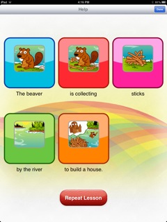 After a student drags the correct phrase to the corresponding colored line he taps “I’m Done!” and the narrator repeats the correct sentence and says, “Now let’s record the sentence.” Kids easily tapped the Record button and repeated their correctly competed sentence. This reinforcement of reading and listening to their own response was so helpful in teaching them ALL the components to a well constructed sentence.