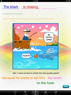Rainbow Sentences-sharkI want to share my latest experience with another outstanding app from Mobile Education Store, “Rainbow Sentences,” designed to help students create grammatically correct sentences using color coded cues.  You can select the settings to give your students the highest level of prompts, color coding phrases to correspond to “who,” “what,” “where,” and “why” as the sentence is constructed, or remove the color coded cues as well as words clumped in phrases and have the student construct the sentence correctly one word at a time. For example, “(The shark)  (is chasing the worm) (on the hook) (because he wants to eat him.)” would be offered as single words all in black, making the task much harder.  Kids loved dragging the blue subject phrase to the blank blue line and dropping it off to Rainbow Sentences-explainstart the sentence. If you get stuck, just press “Play Lesson” and the different components of the sentence will be explained, again with colored boxes corresponding to the different wh-questions answered. My kids started to realize what component they forgot in a good, grammatically correct sentence, such as “where” or “why.” The visual reinforcement in this app was so helpful to them.