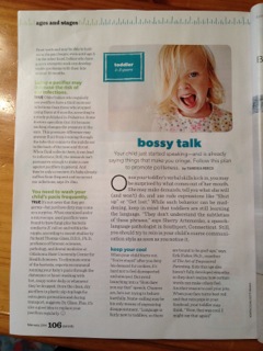 The February issue of Parents Magazine just came out and Tamekia Reece wrote an excellent article addressing the topic of a toddler’s “Bossy Talk.” It is a well-rounded article describing a toddler’s increased verbal skills that as they take off can exhibit demanding, negative or rude remarks. The article looks at answers from several perspectives from experts in parenting, behavior, and speech and language. I was quoted as saying, “They (toddlers) don’t understand the subtleties of these phrases.” The article offers “a plan to promote politeness.” I have to insert here that some of the points can apply to preschoolers too, who could use a correction on their tone or words said to an adult.