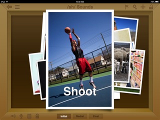 of each other. That is part of the fun–kids have to move the pictures about, or tap them to expand to full screen where the audio repeats the target word. We had fun today, tapping on a little corner of sky, dirt, or a hat peeking out from the pile of photographs and guessing what the word was before it was revealed. The best part is swiping the finished word off the screen. My little guy yesterday sent his word “Up to heaven” and “Outside” as he engaged in a little pretend play with the direction he swiped the photos.