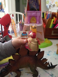 and a princess carrying her birthday sign. One of my especially creative play partners immediately sat her upon a stegasaurus to give her a stately ride to her castle. He hid her “special birthday surprise” in a cupboard in the castle. I love to see what kids do with a toy!