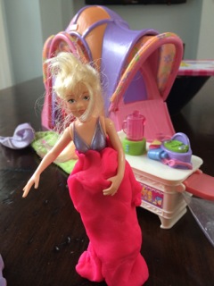 out of playdoh. Caley promptly announced that the alligator was a girl which was convenient for me because I had another female model for the pronoun, she! I didn’t even have to put a pink bow around her neck. Now that the playdoh was out for making the alligator, Caley decided we needed a mermaid and appropriately dressed on of the girls.