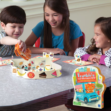 Frankie’s Food Truck Fiasco Game gets kids filling orders from Frankie’s truck full of foodtastic shapes–circle, square, triangle, rectangle, heart, oval, heart, star and moon. Spin to see what shaped food you can select to fill your five-course meal. If the spinner lands on the fly in your soup, return a dish to the box, while the hand grabbing a dish allows you to steal a card from another player. Kids love to chat while they are deciding what goodie to take for their shape. Usually, they asked me what I liked and then they grabbed it! I had a hard time holding on to my pink frosted donut. Here are some ways I’ve used the game to meet goals: