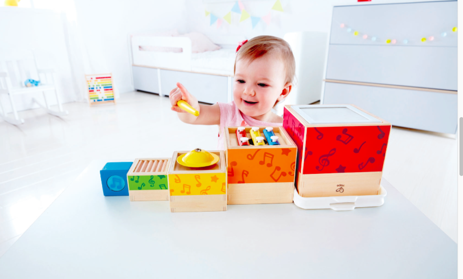 Hape’s “Stacking Music Set” can be stacked or placed horizontally as kids are invited to play each block that holds a musical instrument–xylophone, washboard, drum, cymbal and shaker. When they say, stack, they mean it since after a concert, kids can nest each block and carry away the set with a handle. Research links language and musical processing as they engage in similar areas of the brain. Experimenting with beat, rhythm, and tone, kids are building listening and discrimination skills for language learning. (available in the fall)