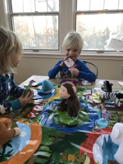 We forgot the monkey was in the refrigerator, as we had “put it someplace cold!” What fun to see how the kids listened to and followed the directions, choosing a spot that matched their descriptions. “Put the camel someplace soft” directed my little friend to place it under our dog standing by!