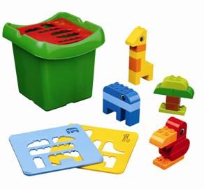 Lego is modeling creativity in the package design of their newest “Creative Sorter” bucket of 23 color-coded blocks for sorting, designing, and building animals. A blue, yellow and red template to build the elephant, giraffe and toucan double as a shape-sorter lid to the bucket. Kids loved to follow the visual on each lid, helping them build their animal, using the blocks they had fit into the template. Enough blocks are left to build a tree for a little munch from the giraffe or a rest for the bird. Visual, motor and language skills are tapped as kids have to match the blocks to fit into the template before building the animal. It wasn’t easy at first for a 3 year-old to learn to take a 3 dimensional block and fit it into the puzzle-like template in 2 dimensions. He had to learn to put the block on its side first. Lots of learning abounds in this bucket!