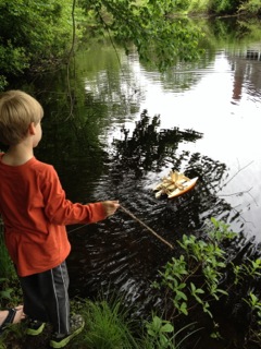neighborhood to launch our catamaran in the pond. Kids helped us wind up the paddle, check the tether so we could pull our boat back in after its ride, and send it off into the water. With a quiet ripple behind it, the boat took off, as if on Mark Twain’s river. Our kid helpers were spellbound and started to offer variations to each new launch–let’s add an acorn man, see if it can hold a big stick, give Polly Pocket a ride, or travel all the way across the pond. This make and play model clearly sparked their imagination and sense of exploration as they sought to play with it in new ways. One little guy said under his breath, ” I need one of these!”