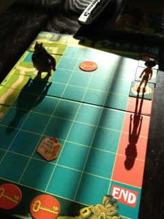We were adding to one of his favorite games, “Race to the Treasure” by Peaceable Kingdom, using some figures from “Jungle Book.” Suddenly, my little friend said, “Look at Mowgli’s shadow!” Nice /sh/ word!! Sure enough, Mogli and his bear friend were casting long shadows on the game and provided a nice practical way to practice his /sh/. We went with this and moved our figures around to get longer and shorter shadows and described them. Everybody needs a little variety once in a while!