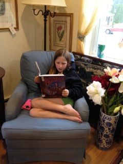 I was on vacation at Elkhart Lake, Wisconsin and visited one of my favorite vintage shops, “Three Gables Consignment,” partly because they have a sign that says, “Open” on one side and “Shut” on the other. As I was browsing I heard a child reading and turned the corner into the next room and found a little girl curled up in a chair, reading to herself out loud. She held a large book called, “Rapunzel’s Revenge,” and was completely absorbed in her book, unaware of my presence. I was so excited to see a child loving a book and soon found out it was the shopkeeper’s daughter. Mom reported that her daughter had made three trips to the library that week alone.