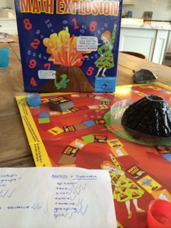 I had a great time with first graders who I am pre-teaching curriculum vocabulary due to word-finding difficulties. The classroom teacher has been very cooperative in giving me a list of vocabulary words by subject, including math. I wrote the words out by operation–addition, subtraction, multiplication and division–and as our friends explained their words, they proudly put a check next to the word they used as they solved the problem for their answer. This is a great group game as you can download math facts for different levels from their website so players of different abilities can compete. The prize for the winner at the end is to pour the little spoonfulls of baking soda he collects into the mouth of the volcano that is holding vinegar. Magic happens and eyes are wide open as the volcano “erupts” for the finale of the game. Here is my full review: