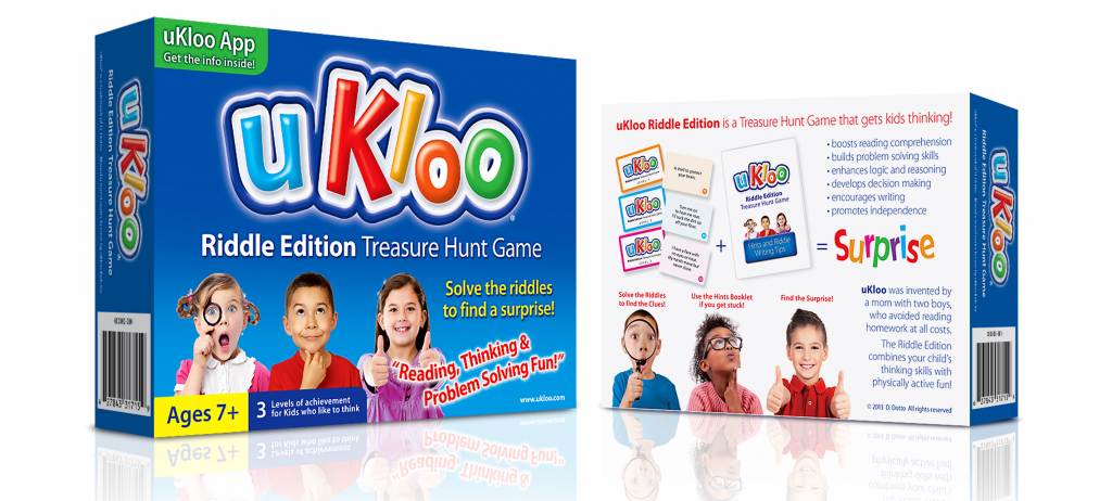 The uKloo family is growing and they’ve done it again– introduced us to yet another fabulously fun treasure hunt game that promotes reading, thinking and now problem solving! Parents choose 4 or more riddle cards from the pack of 75, color coded for three levels of achievement, so siblings can join in. Hide the cards with a “Surprise” card at the end. My little friends alternated between level 1 and 3 cards as kids of different ages solved the puzzles. “If there is rain or snow or sleet, put these on to protect your feet,” sent them off to peek inside the boots sitting at the front door, while “I have a face with no eyes or nose. My hands move but never close.” stumped our friends. Luckily, uKloo Riddle Edition comes with Hints for each riddle card so “Tick, tock, time to wake up” sent the kids right to the clock. Learning extends beyond the game as our friends started making up their own riddles. We composed riddles outside on the picnic table, at breakfast and in the car as kids learned to hone their clues to give just enough information but not too much! I had to put on my kid thinking cap to figure out some of their riddles. They stumped me on “I’m white and sharp and help you eat things.” (teeth) as well as “I’m part of a tree. I’m brown. Sometimes you pick me.” (bark!). The Riddle Writing Tips encourage brainstorming, describing using adjectives, homonyms, synonyms, and antonyms and using figurative language. Who had a clue that stumping your friends could be such “smart” fun!