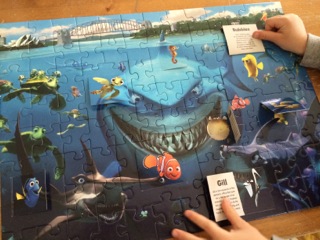 Ravensburger’s new “Finding Nemo Shark Alarm puzzle” is just that. I introduced it to one of my little clients this week and used it for reinforcement for his /sh/ and /ch/ carryover as well as took advantage of the 9 “surprise flaps” which are on slightly larger puzzle pieces and flip open with fun facts on Squirt, Gill, Bloat, Nemo and others. I used these little personality descriptions to launch a language lesson discussing Squirt’s “fearless and easy-going attitude” “spunky personality” and “expressive eyes.” Many of the character descriptions use some abstract expressions to invite conversation such as what does it mean to “have a temper,” “maintain a sunny disposition,” or “blow things out of proportion?”