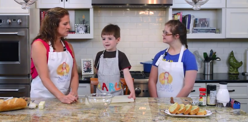 When I visited extended family in Wisconsin this summer, my cousin showed me a video of her 4 year-old, assisting in a cooking lesson with his neighbor, Sarah, who has Downs Syndrome. Charlie is such a cute addition to the video lesson on making Garlic Cheese Bread on “Sarah’s Great Day.” Sarah’s mom prompts the conversation between Sarah and her neighbor buddy, Charlie, as they make the bread.