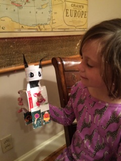 “Do you know what happens when you make a toy? It helps the world!” That’s what 6 year-old Caroline told me as she worked on her Halloween Cat toy, made from Hape’s “Minimals” toy packaging. It was fun to watch her creative mind work as she began after dinner to start cutting apart 2 boxes and the plastic covers to make the body, found a large roll of clear packaging tape and cut it apart to make the legs decorated with halloween stickers. She finished up the cat this morning while it was still dark outside.