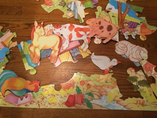 3. Describing. I like to describe what I am looking for. I need the front part of the pig, an animal with orange spots, the scarecrow’s body or the wooden doors of the barn. Kids start to follow that model and describe what piece they are searching for too so there is some nice chatter as they assemble their puzzle.