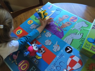 This week I was with a just 3 year-old who loved to assemble my Playdoh animals as we rolled the ball for the body and added “tail, eyes, nose, and ears” as we worked on beginning consonants and vowels. We had completed Ravensburger’s “Counting Animals” puzzle first and it took up most of our table since she wouldn’t let me put it away. Next thing I realized she was matching her Playdoh animals and placing them on the corresponding animals pictured in the puzzle. The elephant joined the pictured animals that were playing water polo and the giraffe stood with the giraffe riding a bicycle! I sat back and fed her words to repeat as she enjoyed the puzzle as the backdrop for her play.
