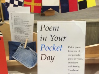 As I am working with several elementary aged kids, I am planning my lessons around their poetry units associated with National Poetry Month. When I visited our public library yesterday I came upon several “pockets” throughout the building, stuffed with poems to share. One could easily adapt this to the classroom as kids choose their favorite poem, make copies and take home to share them with their families.
