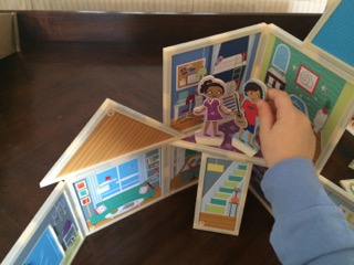 Near the end of our play, Sam looked at me, pointed to Malia’s house and said, “This is a schoolhouse,” and we were off and running with a new story theme! Sam is now directing the play which maximizes learning.