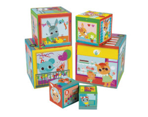Janod Stacking Pyramid–City Friends delights kids with scenes from the city where 9 animal families live. Each side of the cube is a mini story, two mice having a little kiss outside the elevator, a donkey washing his hands, a tiger looking at the flower shop, a panda baking a pie or a giraffe working out, to name a few! The blocks can be ordered 1-10, teaching numbers and sequence, or matched by color to learn beginning colors. One of my favorites is tiger and bunny having a cup of coffee together. Kids can’t wait to crash it down but guess what? That’s okay because now we can build horizontally. We joined our cubes to make a city scape with mouse roller skating past a store, bunny talking on her cell phone and elephant offering fresh squeezed lemonade. There is such a huge opportunity to describe setting and action with the animals walking through the city. Parents will love to join the play as there is much to contribute by describing each cube that their child places down and is looking at. After our masterpiece we get to swat at it and start over too!
