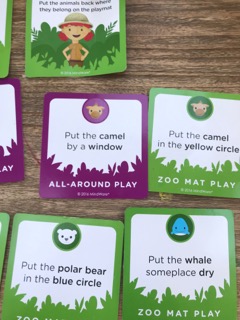 “Zoo on the Loose, A Hide and Seek Animal Adventure” by Mindware is right in sync with preschoolers as they are in charge of hiding and finding animals according to directions that include plenty of concepts to process–spacial relationships, colors, shapes, and descriptors. Unfold the play zoo mat and place the 5 cuddly animals, camel, zebra, bear, whale and monkey in their zoo homes. Play cards send the animals to hide on the mat or all around the house. Our kids did both which added a memory component because when we chose a zookeeper card, we had to return all the animals to their zoo homes on the mat. We forgot the monkey was in the refrigerator, as we had “put it someplace cold!” What fun to see how the kids listened to and followed the directions, choosing a spot that matched their descriptions. “Put the camel someplace soft” directed my little friend to place it under our dog standing by!