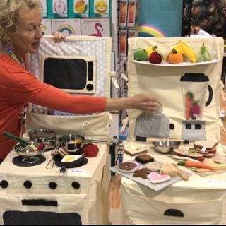 know my Grammy friends were very interested in several of the larger pretend play toys that could be minimized for storage when the grandkids go home. One of the most innovative products I saw (and others were talking about it too) was Kangaroo’s “Pop-oh-Ver’s” Stove and Market, a fabric stove, oven and microwave that is so cleverly designed by a mom of 7, that it fits over a chair! Talk about lots of pretend play potential that you can fold up and put away. The microwave door opens to a clear pocket to insert your bacon. So many of Simplay3’s products have design elements for take-apart packability. Their “Carry and Go Track Table” is fun ready to happen. The sturdy vehicle track has play options on both sides–race and train tracks, and an easy to carry handle. Kids bring the cars and people to the set for their own story.